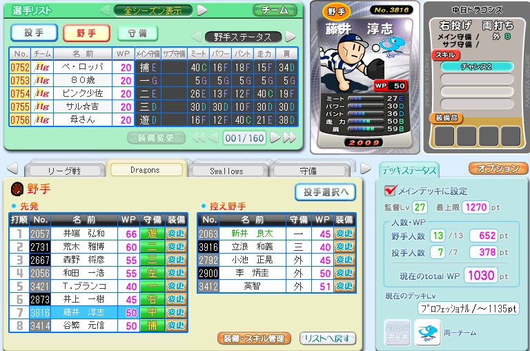 10か月ほどファミスタをやってなかったので08年、09年が混ざってますが、やっぱり藤井がいると09年の打線だなーって気がしますねw